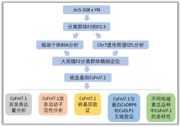本研究首先通過(guò)長(cháng)果把品種Jin5-508和短把品種YN雜交構建的性狀分離群體(F2和F2:3),從F2中選擇果把長(cháng)度極端個(gè)體構建DNA混池進(jìn)行高通量測序,BSA分析和傳統遺傳圖譜共同在7號染色體上定位到一個(gè)主效QTL。再通過(guò)分離群體精細定位、基因表達分析、轉基因驗證等方法確定了調控果把長(cháng)度基因CsFnl7.1。同時(shí)發(fā)現CsFnl7.1啟動(dòng)子區域的多態(tài)性調控CsFnl7.1的表達水平。結合自然群體材料的多樣性分析,發(fā)現CsFnl7.1位點(diǎn)可能起源于印度。