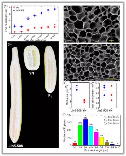 授粉30天后,雙親Jin5-508和YN黃瓜果把長(cháng)度不再增長(cháng),于是選擇該時(shí)間節點(diǎn)作為果把長(cháng)度鑒定的時(shí)期(圖1a)。Jin5-508果把長(cháng)度顯著(zhù)長(cháng)于YN,這種差異是因為Jin5-508果把果肉細胞體積大于YN,而非細胞數增多(圖1b,c,d,e)。統計F1群體、回交群體和F2群體果把長(cháng)度發(fā)現,F1群體表現出中親表型,而回交群體表型更偏向于輪回親本,F2群體表現出連續的近正態(tài)分布(圖1f),以上結果表明黃瓜果把長(cháng)度是數量性狀。