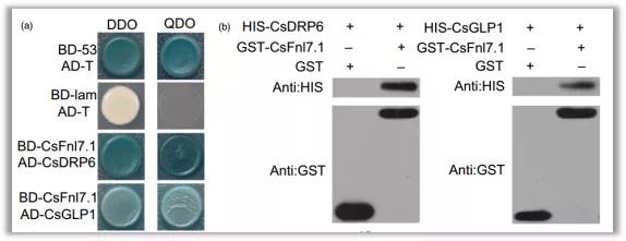 利用酵母雙雜技術(shù),以CsFnl7.1蛋白為誘餌篩選與其互做的蛋白,結果顯示共得到53個(gè)陽(yáng)性克隆,在這些蛋白中有多個(gè)與細胞伸展相關(guān),包括CsDRP6和CsGLP1(圖8a)。體外pull down實(shí)驗顯示,融合蛋白HIS-CsDRP6和HIS-CsGLP1可以被GST-CsFnl7.1高效捕獲,而對照GST則不能(圖8b)。以上結果充分說(shuō)明CsFnl7.1與CsDRP6、CsGLP1之間存在互做關(guān)系。