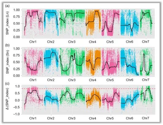 作者在1231個(gè)F2群體(Jin5-508 × YN)選擇了長(cháng)把和短把單株各50個(gè),構建2個(gè)極端性狀DNA混池,對該混池及雙親進(jìn)行高通量測序及BSA分析。親本測序深度分別為34x(Jin5-508)和20x(YN),混池測序深度分別為61x和52x。測序數據與黃瓜參考基因組9930比對,2個(gè)混池分別開(kāi)發(fā)了342,496和399,764個(gè)SNP,基于SNP index算法,在chr7上定位到一個(gè)主效QTLFnl7.1?(閾值0.833),區間范圍9.98–14.61 Mb(圖2c)。