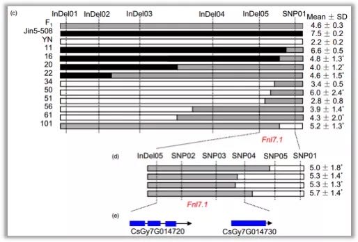 為驗證BSA的定位結果,作者在3個(gè)不同環(huán)境下調查了102個(gè)F2:3家系(Jin5-508 ×?YN)的表型,結果顯示F2:3表型也符合正態(tài)分布(圖3a)?;陔p親重測序數據,作者在7號染色體上開(kāi)發(fā)了72個(gè)雙親多態(tài)標記(SNP和InDel),用這些標記合F2群體構建7號染色體的連鎖圖譜。結合F2:3群體3個(gè)環(huán)境的表型以及F2遺傳圖譜,共同定位到了1個(gè)主效QTL(圖3b),表型貢獻率在27.9%-32.7%。綜合BSA定位和遺傳圖譜定位結果,最終吧QTL Fnl7.1定位在7號染色體上2.85Mb的區間內。
