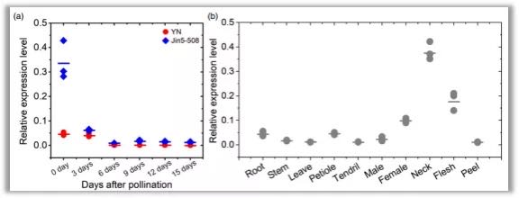 選擇雙親授粉后0-15天幼瓜進(jìn)行CsFnl7.1的表達量分析,qRT-PCR結果顯示授粉后6個(gè)時(shí)間點(diǎn),CsFnl7.1在雙親中表達差異不顯著(zhù),而且表達量表現出持續降低(圖5a)。但是,在授粉當天,CsFnl7.1在Jin5-508中表達量顯著(zhù)高于YN。組織特異表達分析顯示,CsFnl7.1在果把中表達量最高(圖5b)。?
