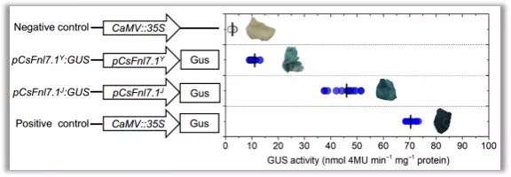 序列分析顯示,雙親CsFnl7.1啟動(dòng)子區存在多處序列差異(25個(gè)SNPs和7個(gè)InDels),因此作者將雙親的啟動(dòng)子進(jìn)行了克隆,分別與GUS基因構建整合質(zhì)粒,轉化煙草葉片進(jìn)行啟動(dòng)子活性分析。發(fā)現Jin5-508啟動(dòng)子(pCsLEAJ)活性是YN啟動(dòng)子(pCsLEAY)活性的4倍(圖6)。這與轉錄組分析結果一致(授粉當天CsFnl7.1在Jin5-508表達量顯著(zhù)高于YN),從而說(shuō)明CsFnl7.1表達受順式調控。