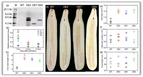 為進(jìn)一步驗證基因功能,作者將CsFnl7.1轉入短把品種“D8”中,得到3個(gè)T2代單株(OE4、OE7和OE8)。Southern雜交顯示OE4、OE7和OE8分別插入1、1和2個(gè)拷貝(圖7a)。與對照相比,3個(gè)轉基因個(gè)體CsFnl7.1表達量顯著(zhù)提高,同時(shí)果把長(cháng)度也更長(cháng),說(shuō)明CsFnl7.1確實(shí)能夠影響果把長(cháng)度(圖7b,c,d)。分析果把果肉細胞的個(gè)數和大小發(fā)現,轉基因個(gè)體比對照個(gè)體細胞更大,但細胞數在兩者之間沒(méi)有顯著(zhù)差異(圖7e,f,g),從而說(shuō)明CsFnl7.1是通過(guò)調控細胞伸展來(lái)影響果把長(cháng)度。