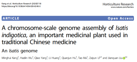 2020年2 月1日,四川大學(xué)生命科學(xué)學(xué)院劉建全課題組與華中農業(yè)大學(xué)作物遺傳改良國家重點(diǎn)實(shí)驗室李再云課題組首次完成了菘藍(Isatis indigotica,2n=14)染色體級別基因組圖譜繪制。該研究利用Pacbio測序(140X)結合北京百邁客生物技術(shù)有限公司的Hi-C技術(shù)(284X)組裝得到294Mb高質(zhì)量基因組(contigN50=1.2Mb)?;谕此阉骱凸δ茏⑨?zhuān)_定了該物種主要化合物(如吲哚類(lèi)、萜類(lèi)、黃酮、木脂素等物質(zhì))的可能生物合成通路和相關(guān)的候選基因。該研究強調了基因組測序在鑒定藥用植物代謝產(chǎn)物合成候選基因中的重要性,為今后十字花科植物比較基因組等研究提供了重要遺傳信息。