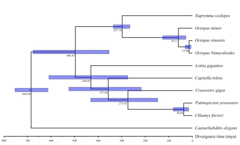 比較基因組學(xué)分析發(fā)現預測到的31676個(gè)基因中有24698個(gè)基因可被聚類(lèi)到17020個(gè)基因家族。其中有741個(gè)基因家族為10個(gè)物種共有,包含有10653個(gè)同源基因。利用10個(gè)物種的238個(gè)單拷貝同源基因構建進(jìn)化樹(shù),結果表明長(cháng)蛸的分化時(shí)間早于中國真蛸和加州雙斑蛸,而中國真蛸與加州雙斑蛸關(guān)系更近,其分化時(shí)間約為13.88 Mya(圖3)。