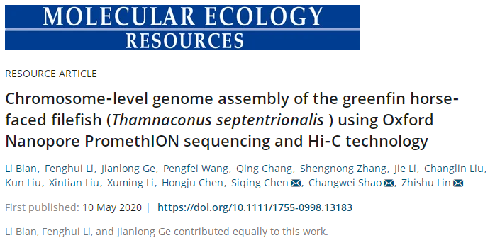 2020年5月,中國水產(chǎn)科學(xué)研究院黃海水產(chǎn)研究所陳四清研究員團隊與北京百邁客生物科技有限公司合作完成了超高質(zhì)量的綠鰭馬面鲀基因組,相關(guān)研究成果發(fā)表在知名期刊Molecular Ecology Resources上。本次研究基于納米孔測序技術(shù)(Nanopore)和染色體構象捕獲技術(shù)(Hi-C)完成的基因組僅包含242個(gè)Contigs,Contig N50高達22.46 Mb,并將99.44%序列掛載到20條染色體上,實(shí)現了海洋魚(yú)類(lèi)基因組組裝質(zhì)量質(zhì)的飛躍。