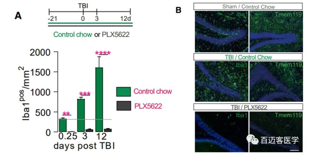 圖1B.plx5622處理小鼠術(shù)后12天海馬內Iba1pos和TMEM119pos小膠質(zhì)細胞(綠色)的丟失