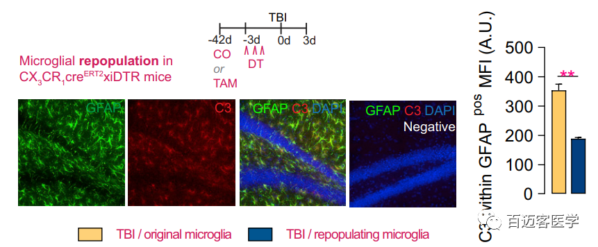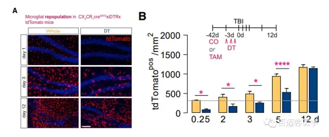 圖2A.遺傳模型鼠在停止注射DT和TBI后 小膠質(zhì)細胞(紅色)的再生