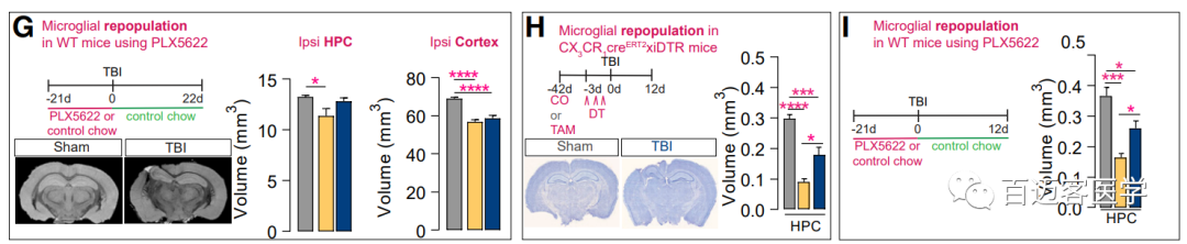 研究還發(fā)現,經(jīng)歷過(guò)小膠質(zhì)細胞耗竭和再生的小鼠的大腦海馬組織體積更大(圖3G-I)。