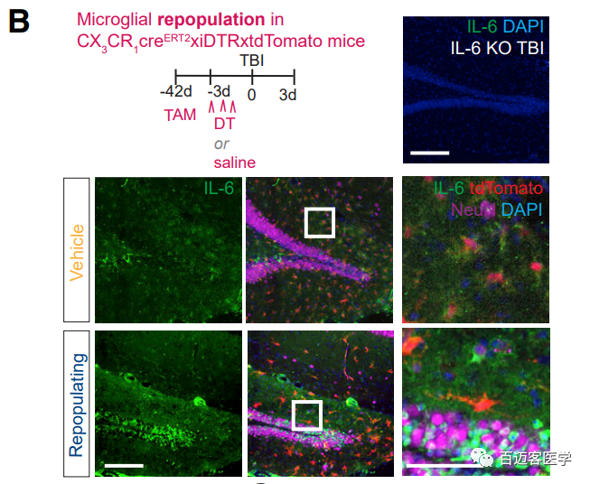 ?圖4 .TBI遺傳模型小鼠中IL-6的細胞來(lái)源及正在進(jìn)行再生的小膠質(zhì)細胞