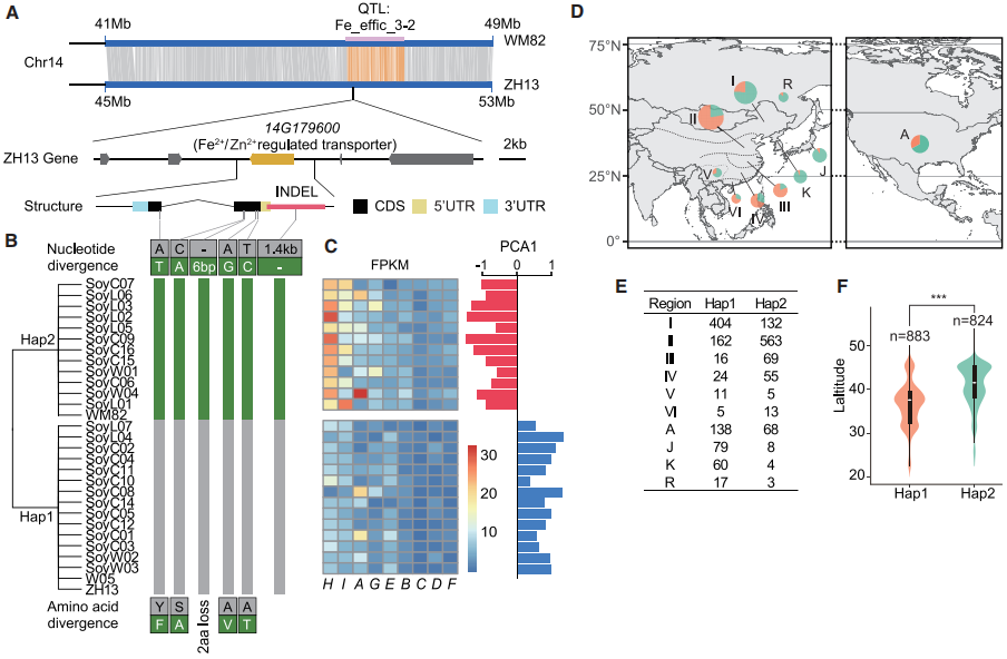 結構變異可能會(huì )通過(guò)改變基因區或基因側翼區的序列影響基因的轉錄調控及表達。如,基因的串聯(lián)重復可能會(huì )引起基因劑量的變化,外顯子的復制可能會(huì )引起可變剪接,順式作用元件區的插入或缺失可能會(huì )破壞或者改變轉錄調控因子結合位點(diǎn)。例如,大豆14號染色體上存在一個(gè)調控Fe2+/Zn2+轉運蛋白的基因SoyZH13_14G179600,一些品種的基因組中,該基因的啟動(dòng)子區存在一個(gè)1.4kb的缺失,RNA-seq數據分析顯示,該啟動(dòng)子缺失會(huì )使轉運蛋白表達量降低[3]。