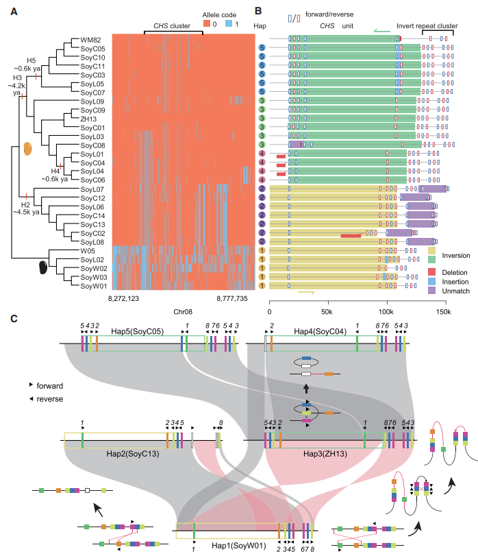 泛基因組擁有群體完整的基因組多樣性,可以為植物進(jìn)化與馴化研究提供更完整、更寬泛的支持。如大豆的種皮顏色是大豆馴化過(guò)程中的一個(gè)重要表型性狀,從野生大豆的黑色種皮演變成栽培大豆的黃色種皮,是因為一個(gè)查爾酮合成酶基因發(fā)生序列倒置或序列復制后倒置導致了該基因沉默。通過(guò)大豆泛基因組單倍體型進(jìn)化分析,將29份材料分為5個(gè)主要的單倍型(H1- H5),并對不同單倍體型馴化時(shí)間和順序進(jìn)行了研究,剖析了大豆種皮顏色馴化的歷史[3]。