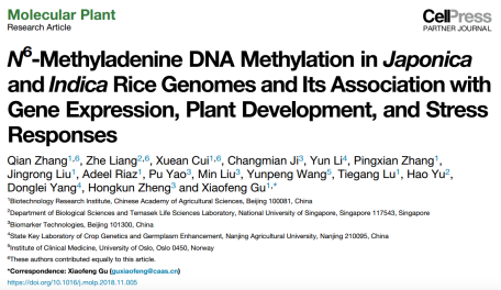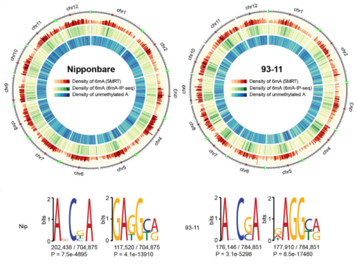 PacBio對粳稻Nip與秈稻93-11基因組更新:利用PacBio對Nip和93-11進(jìn)行測序及Illumina平臺進(jìn)行g(shù)ap填充和誤差校正后,Nip基因組大小為380.7 Mb(contig N50=16.97 Mb),93-11基因組大小為396 Mb(contig N50=9.64 Mb);進(jìn)一步通過(guò)SMRT(單分子實(shí)時(shí)測序系統Single MoleculeReal Time)測序數據,在Nip和93-11中分別檢測出704875個(gè)和784912個(gè)6mA位點(diǎn)。