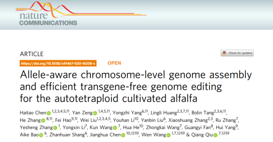 文章中利用了基因組三代測序技術(shù),獲得染色體級別的紫花苜?;蚪M的同時(shí),攻克了同源多倍體物種基因組組裝難題,組裝獲得了4個(gè)單倍型紫花苜?;蚪M,為后續基因編輯研究做了重要的鋪墊,進(jìn)而通過(guò)新技術(shù)CRISPR/Cas9基因編輯對控制相應表型性狀基因進(jìn)行改造,對于紫花苜蓿后續分子生物學(xué)研究具有重要而深遠的意義。