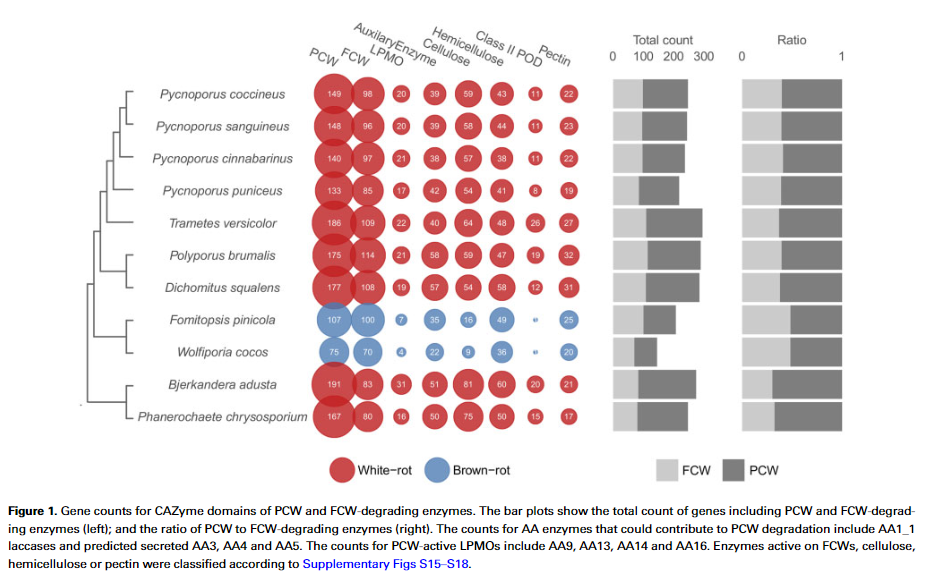 與褐腐菌相比,白腐菌含有更高比例的PCW(植物細胞壁)降解活性相關(guān)的CAZymes和FCW(真菌細胞壁)降解活性相關(guān)的CAZymes,這也是白腐菌與褐腐菌降解木質(zhì)纖維素的能力不同的重要原因。