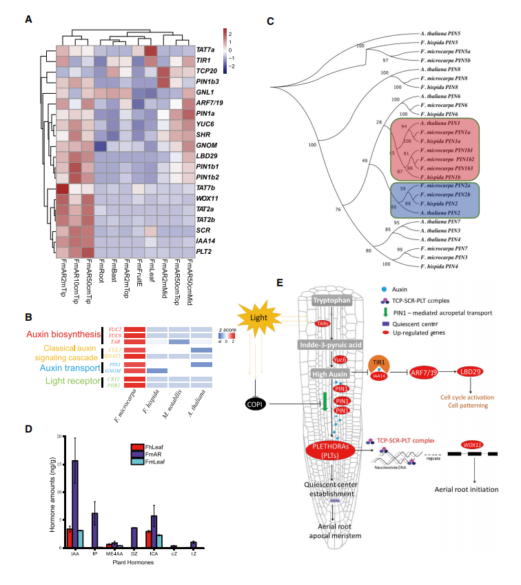 細葉榕與對葉榕顯著(zhù)差異表現為前者有氣生根而后者沒(méi)有,為了尋找觸發(fā)氣生根的途徑,作者在氣生根尖鑒定到811個(gè)高表達基因。這些高表達的基因在一系列與運輸相關(guān)的生物過(guò)程中顯著(zhù)富集。通過(guò)對PIN家族的系統發(fā)育分析,發(fā)現PIN1基因存在顯著(zhù)的拷貝數變異(CNV),并確定了兩個(gè)進(jìn)化的PIN1亞群。第一組(PIN1a)在兩種榕樹(shù)和擬南芥中均被鑒定到,第二組(PIN1b)僅于兩種榕樹(shù)中。RNA-seq表明,FmPIN1a在大多數被測組織中均有表達,而FmPIN1b1、FmPIN1b2FmPIN1b3在氣生根樣品中高表達。光受體CRY2和PHR2的拷貝數增加,TAR(如TAT2a、TAT2b和TAT7b)和YUC編碼基因(如YUC6)的表達增加進(jìn)一步加速了IAA的積累,與對葉榕相比,細葉榕氣生根尖的內源生長(cháng)素濃度高出5倍。說(shuō)明生長(cháng)素的增加引發(fā)了氣生根的發(fā)育,光促進(jìn)的生長(cháng)素依賴(lài)途徑與氣生根的發(fā)生、生長(cháng)和形態(tài)形成有關(guān)。