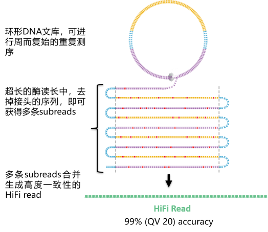 HiFi reads(High Fidelity reads)是2019年由PacBio推出的基于環(huán)化共有序列(Circular Consensus Sequencing,CCS)模式產(chǎn)生的既兼顧長(cháng)讀長(cháng)(10-20kb的長(cháng)度)又具有高精度(>99%z確率)的測序結果。