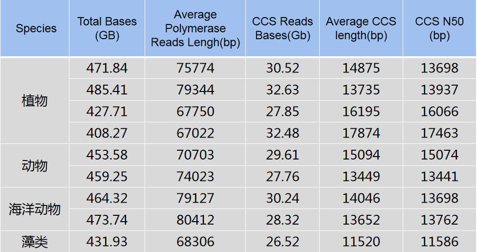 百邁客自2019年引進(jìn)PacBio SequelⅡ平臺以來(lái),在HiFi測序方面已經(jīng)積累了大量的經(jīng)驗,在技術(shù)人員的不斷優(yōu)化下,HiFi文庫單cell產(chǎn)出更是有了新的突破,下面跟大家分享一下部分HiFi文庫產(chǎn)出情況(表2)。在統計近1個(gè)月的HiFi cell中,我們單cell平均產(chǎn)出達416Gb。其中,單cell產(chǎn)出達400 Gb以上的占比達68%,同時(shí),單cell的HiFi reads數據量高達32 Gb,占原始產(chǎn)出的比例*高可達7.96%。在讀長(cháng)方面,平均酶讀長(cháng)已超70Kb,HiFi reads長(cháng)達18Kb。