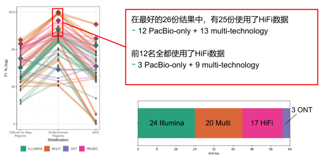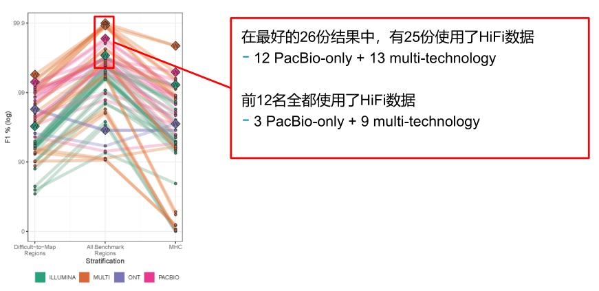 基因組測序中重要的自然是z確率,只有保證較高的z確率,基因組的研究才有價(jià)值。下圖展示了最近的PrecisionFDA 真實(shí)挑戰賽V2的結果(圖6),在單一技術(shù)參賽結果中,使用PacBio HiFi數據(粉紅色)在所有類(lèi)別中,無(wú)論是全基因組范圍(“所有基準區域”),還是在難以映射的區域或是主要的組織相容性復合體(MHC)中均提供了較高的z確性。所有的多技術(shù)參賽結果(橙色)中都使用了PacBio HiFi數據[2]。