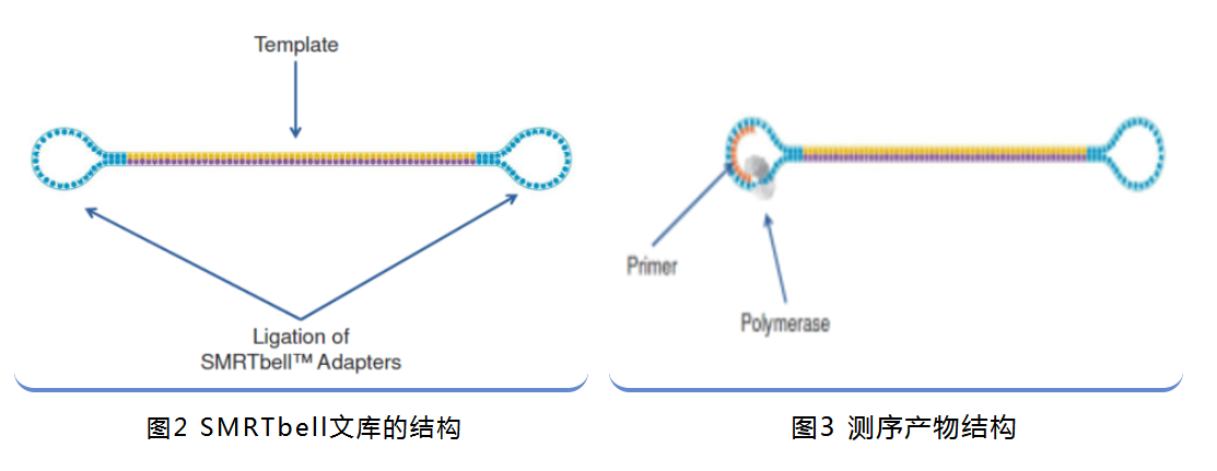 bell即“鈴”的意思,如圖2,構建完成的bell文庫形狀就如同一個(gè)啞鈴。其主要組成部分是:發(fā)卡狀的接頭(Hairpin Adapter)和雙鏈DNA模板(Double Stranded DNA Template)。而文構建完成后、測序前還需要完成bell文庫、Sequencing Primer、DNA Polymerase的混合工作(測序引物退火結合bell文庫,然后引物-bell文庫復合物結合DNA聚合酶)。最終產(chǎn)物如圖3所示。