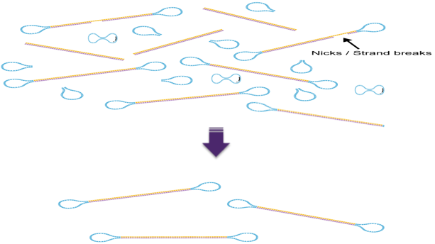以基因組HiFi文庫為例(15-20K文庫)(圖4)。當得到gDNA后,先利用G-tube管或Megaruptor System將基因組片段化至合適大小,而后通過(guò)去除單鏈懸突、損傷修復和末端修復等步驟,得到完整的雙鏈插入片段。接下來(lái),通過(guò)將接頭連接至雙鏈DNA來(lái)創(chuàng )建SMRTbell文庫,從而得到環(huán)狀模板。完成接頭連接后,需要對連接產(chǎn)物進(jìn)行純化,利用酶處理(圖5)來(lái)消化線(xiàn)性或內部損傷環(huán)形DNA分子(游離的Hairpin Adapter、兩端未連接Adapter的DNA模板、已成環(huán)但內部有損傷的DNA模板),酶處理完畢后,一般會(huì )利用Bulepippin或Sage ELF System切膠回收目標大小范圍內的文庫。