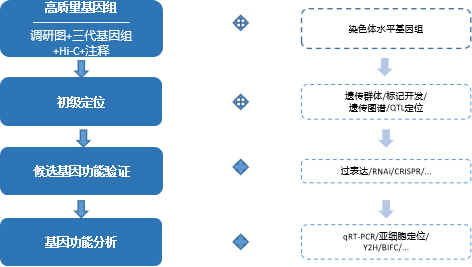 遺傳圖譜是目前經(jīng)典的功能基因定位策略,主要基于高通量測序技術(shù)開(kāi)發(fā)單核苷酸多態(tài)性位點(diǎn)(SNP),并計算多態(tài)性標記間的遺傳連鎖距離,構建高密度遺傳圖譜,最后結合性狀調查對目標區域進(jìn)行定位。數量性狀基因座(quantitative trait locus,QTL)是指基因組中引起數量性狀變異的座位。作物的產(chǎn)量、質(zhì)量、株型、生長(cháng)發(fā)育等大多數重要經(jīng)濟性狀及農藝性狀通常都為數量性狀。利用分子標記,通過(guò)連鎖分析進(jìn)行QTL定位,是遺傳學(xué)中研究數量性狀相關(guān)功能基因的基本手段和確定分離并分離目標基因的前提。而優(yōu)質(zhì)的基因組才能為性狀精準定位提供有力支持。