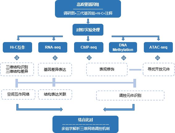 表觀(guān)遺傳(epigentics) “epi”表示“其上”或“超越”,genetics只設計基因的結構層次,而epigenetics則涉及基因如何發(fā)揮其功能以及基因間的互作關(guān)系?;蚪M結合表觀(guān)調控可更加深入的剖析物種在何時(shí)、何地、以何種方式去應用遺傳信息的指令。多種表觀(guān)遺傳研究手段間可相互組合,從三維基因、修飾表達、調控元件等多種層面解析不同調控原理。