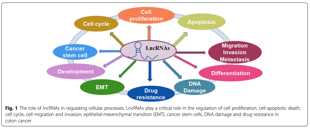 越來(lái)越多的證據表明,lncRNA在結腸癌的發(fā)生和發(fā)展中起著(zhù)至關(guān)重要的作用,一項研究使用TCGA數據集的RNA測序數據在結腸腫瘤中鑒定了大約200個(gè)差異表達的lncRNA。LncRNA與患者預后,細胞增殖,細胞凋亡,細胞轉移和侵襲,細胞周期,上皮-間質(zhì)轉化(EMT),癌癥干細胞(CSC)和耐藥性相關(guān)(圖1)。