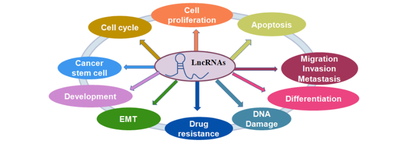 近年來(lái),已證明非編碼RNA(ncRNA)參與結腸癌的發(fā)生和發(fā)展。眾所周知,ncRNA屬于一類(lèi)轉錄本,主要被翻譯成蛋白質(zhì),它們在各種細胞和生理過(guò)程中也起著(zhù)重要作用。長(cháng)度超過(guò)200個(gè)核苷酸的長(cháng)非編碼RNA(LncRNA)通常通過(guò)競爭內源RNA(ceRNA)參與多種生物過(guò)程,包括細胞增殖,分化,發(fā)育,凋亡和轉移。LncRNA可以與RNA,DNA和蛋白質(zhì)相互作用,形成RNA-RNA,RNA-DNA,RNA-蛋白質(zhì)復合物,從而通過(guò)多種機制調節基因表達,包括轉錄調節,mRNA穩定性和翻譯。LncRNA可以充當蛋白質(zhì)的引導分子,支架或誘餌分子,以回收蛋白質(zhì)或RNA。LncRNA也可以影響染色質(zhì)的結構并調節基因表達。