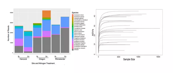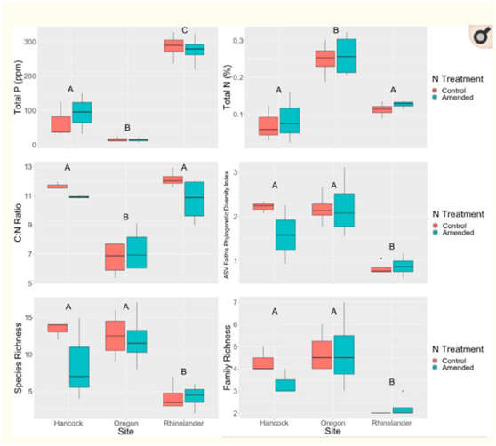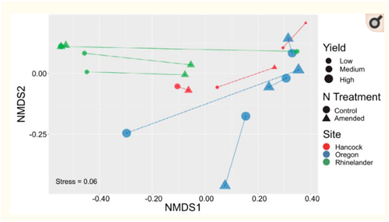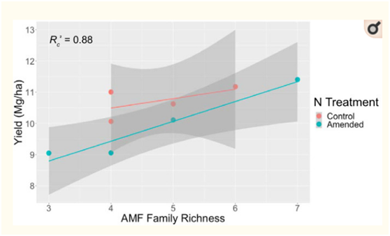 在包括施氮處理在內的線(xiàn)性混合效應回歸模型中,AMF的?ASV多樣性指標不能顯著(zhù)預測任何地點(diǎn)的柳枝稷產(chǎn)量。在科水平上,AMF豐富度是俄勒岡地塊產(chǎn)量的邊際顯著(zhù)預測因子;俄勒岡地區AMF群落中科水平的豐富度越高,柳枝稷產(chǎn)量就越高,表明隨著(zhù)AMF家族的豐富,柳枝稷可能由于A(yíng)MF功能互補而受益于更大的多樣性。