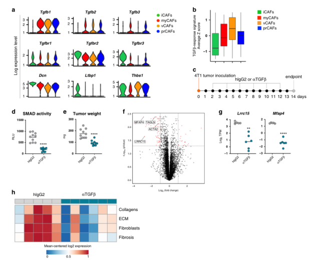 綜上所述,這些數據促使我們研究TGFβ-阻斷劑在體內對CAF表型和功能的相對影響。為此,6周齡雌性小鼠接種4T1腫瘤細胞,隨后用TGFβ阻斷抗體或同型對照處理,研究設計如圖2c所示。結果表明這種腫瘤進(jìn)展的延遲似乎不是由抗TGFβ對腫瘤細胞的直接作用引起的,更可能是TGFβ阻斷后微環(huán)境變化的結果。事實(shí)上,使用TGFβ中和抗體可導致整體基因表達的顯著(zhù)差異,這在對大量冷凍腫瘤RNAseq分析中得到證實(shí)(圖2f)。與這些發(fā)現一致的是,我們通過(guò)分析與膠原沉積和纖維化相關(guān)的基因特征,描述了抗tgfβ治療小鼠腫瘤中整體促纖維化程序的顯著(zhù)減少(圖2h)。綜上所述,這些數據表明靶向TGFβ影響了腫瘤微環(huán)境中的成纖維細胞動(dòng)力學(xué)。