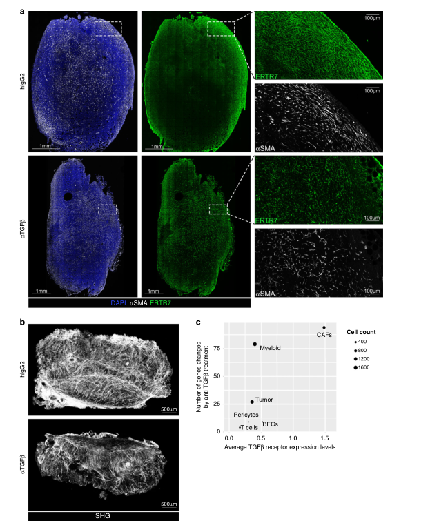 根據觀(guān)察到的基因表達變化,作者利用冷凍保存的腫瘤從同型或抗tgfβ處理小鼠切片,染色和共聚焦顯微鏡成像等方法確定了TGFβ-阻斷是否對構成腫瘤建筑框架結構產(chǎn)生損傷。Acta2表達的鏡像變化,肌成纖維細胞網(wǎng)絡(luò )的顯著(zhù)改變,細長(cháng)的紡錘形細胞稀少等揭示了瘤內結構組織的顯著(zhù)變化,表明TGFβ阻斷抗體處理小鼠的高網(wǎng)狀纖維網(wǎng)絡(luò )丟失(圖3a)。通過(guò)對全器官的斷層掃描,進(jìn)一步證實(shí)了膠原骨架形成的整體損傷,如圖3b所示。單細胞RNAseq分析結果表明基因的數量受anti-TGFβ治療明顯更大 (圖3 c),也與先前的結果一致。