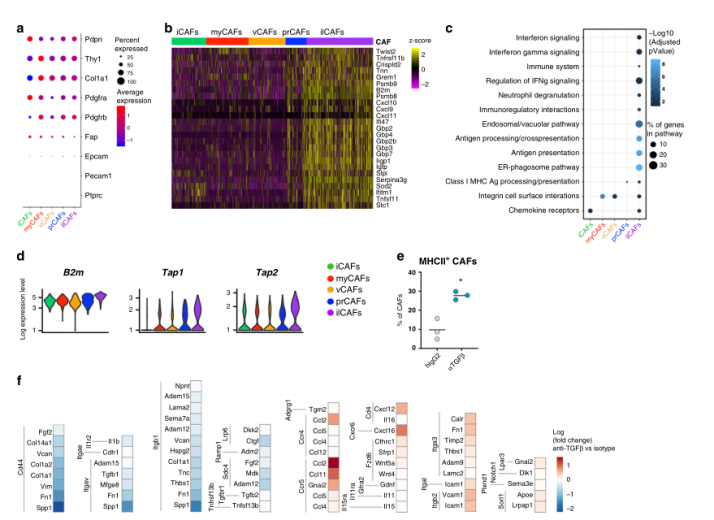 為了獲得關(guān)于新鑒定的CAF亞群功能特性的更多信息,作者研究了這類(lèi)亞群的轉錄特征。然而,對ilCAFs中差異表達基因分析發(fā)現,在干擾素(IFN)信號控制下許多鳥(niǎo)苷晚結合蛋白(Gbp)家族成員發(fā)生富集(圖5b)。與這些發(fā)現一致的是,在區分ilCAFs與其他CAF亞群的基因中, ilCAFs中IFN信號反應上調,IFN水平調控的通路增強,包括抗原加工和展示(圖5c)。編碼MHC蛋白和MHC相關(guān)分子的基因在ilCAFs中高表達(圖5b-d)。體內TGFβ-阻斷后,在CAFs中檢測到MHCII蛋白上調(圖5e),也發(fā)現ilCAFs在腫瘤內對指導T細胞的轉運發(fā)揮重要作用(圖5b)。
