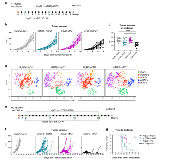 到目前為止所描述的數據表明,TGFβ-阻斷形成了腫瘤成纖維細胞的形態(tài),在CAFs中釋放了IFN信號,促進(jìn)了細胞毒性T細胞的浸潤和激活。由于這些變化被預測有助于產(chǎn)生抗腫瘤免疫反應,我們測試TGFβ中和與阻斷免疫治療具有協(xié)同作用。結果表明單獨抗pd1并不影響4T1腫瘤的生長(cháng),單獨使用TGFβ-阻斷劑則顯示出一些活性(圖7c),TGFβ中和可以促進(jìn)PD1免疫治療,在這種難以治愈的腫瘤模型中(圖7c),聯(lián)合抗TGFβ和抗pd1治療后,CAF和ilCAFs外觀(guān)明顯重塑(圖7d)。重要的是,TGFβ-阻斷在該模型中導致腫瘤微環(huán)境發(fā)生明顯變化,表明基質(zhì)免疫重構。