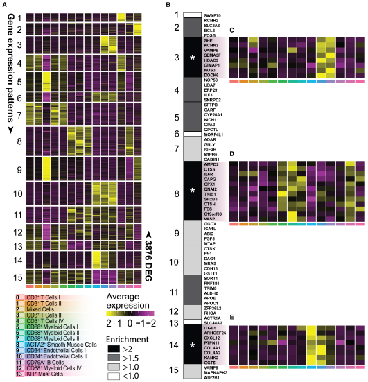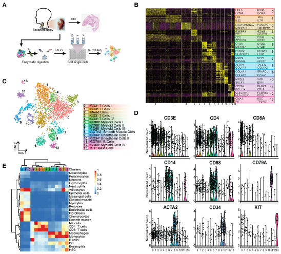 我們觀(guān)察到3個(gè)非免疫細胞簇(簇8,9和10;表達CD34和ACTA2[肌動(dòng)蛋白α2,平滑肌])和11個(gè)白細胞簇(圖1B和1D)。后者包括5個(gè)淋巴細胞簇(第0、1、3、4、11簇;表達CD3E、CD4、CD8、CD79A),5個(gè)髓系簇(第5、6、7、12和13簇;表達CD14、CD68、KIT),和1個(gè)沒(méi)有明確的細胞類(lèi)型表達譜的混合細胞的簇(第2簇),但與其他簇有相似的基因表達,似乎主要含有凋亡的髓系細胞和T細胞(圖1B和1D)。T細胞是我們數據集中豐富的群體,占所有分析細胞的52.4%,而髓系群體占所有細胞的18.5%。