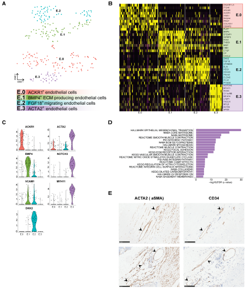 EC簇之間的聚集以及SMC相關(guān)通路的富集(圖2D),表明這個(gè)亞群可能正在經(jīng)歷內皮細胞向間充質(zhì)細胞的轉變,或者反之亦然。為了驗證這些發(fā)現,我們觀(guān)察了ACTA2和CD34在連續的組織學(xué)切片上的表達(圖2E)。