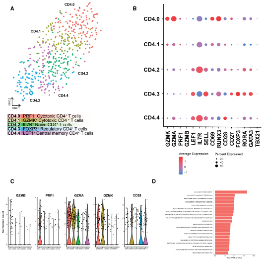 為了更詳細地定義T細胞,我們分離和重新聚類(lèi)CD4+T細胞,發(fā)現了5個(gè)亞類(lèi)(CD4.0-CD4.4,圖3A),其中主要的區別是它們的激活狀態(tài),而不是通常用于定義CD4+T輔助亞群的轉錄因子和細胞因子(圖3B和3C)。CD4.0和CD4.1具有細胞毒基因表達譜,此外,這一簇中的基因表達證實(shí)了與適應性免疫反應相關(guān)的促炎通路的富集(圖3D)。