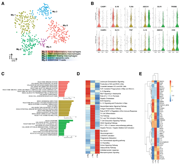 我們分離和重新聚類(lèi)動(dòng)脈粥樣硬化性髓系細胞,揭示了5種不同的表型(My.0-My.4,圖4A)。My.0、My.1和My.2很可能代表不同激活狀態(tài)的巨噬細胞。促炎標志物基因(圖4B)以及免疫和炎癥通路的富集結果(圖4C)表明,My.0和My.1亞類(lèi)由促炎巨噬細胞組成。My.0顯示了最近招募的巨噬細胞的特征(圖4C,D),表明共表達的炎癥體被激活(圖4B)。與My.0和My.1相比,My.2缺乏明顯的促炎標志物,并顯示巨噬細胞和泡沫細胞的跡象。