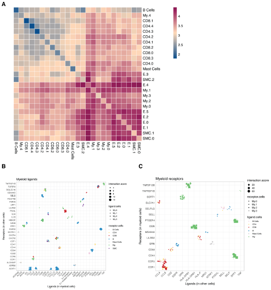 接下來(lái),我們基于CellPhone?DB v2.0檢查了不同細胞類(lèi)型之間潛在的配體-受體相互作用,以預測病變內的細胞間通訊。淋巴細胞和肥大細胞的潛在相互作用的絕對數低,而髓系細胞、內皮細胞和平滑肌細胞的相互作用的絕對數高(圖5A)。