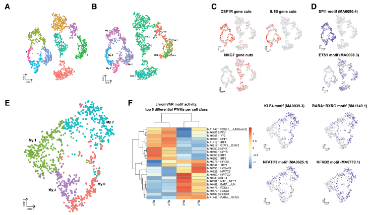 利用scATAC-seq,我們檢測了人類(lèi)斑塊中髓系和T細胞的開(kāi)放染色質(zhì)啟動(dòng)子和增強子圖譜。我們用scATACseq鑒定了4個(gè)髓系細胞簇和5個(gè)T細胞簇 (圖6A和6B)。巨噬細胞(CSF1R,IL1B)和T細胞特異性基因(NKG7)的開(kāi)放染色質(zhì),以及巨噬細胞和T細胞(SPI155和ETS156)的細胞型TFs的motif的富集,明確了細胞類(lèi)型之間的劃分界限(圖6C和6D)。轉移的髓系群體被重新聚類(lèi),類(lèi)似于scRNA-seq簇(圖6E)。