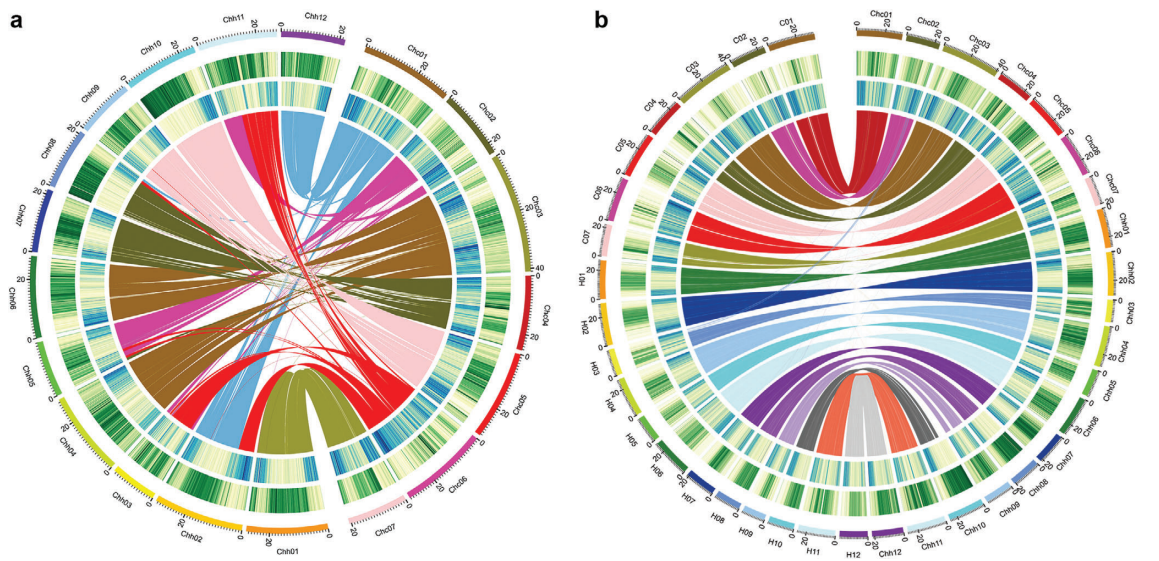 作者通過(guò)PacBio+BioNano+Hi-C+Illumina共組裝獲得530.8?Mb基因組(≈67%流式評估大??;≈77% survey評估大??;比對發(fā)現未裝出的為重復序列),contig N50=6.5?Mb,并將組裝的基因組序列掛載至19條假染色體上(掛載率97.23%;定序與定向率93.33%)(表1)。通過(guò)與二倍體C.sativus (CC)和C.hystrix(HH)染色體的C01–C07和H01–H12對應,將C.×hytivus染色體命名為Chc01–Chc07和Chh01–Chh12(圖1)。
