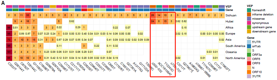 對截至2020年11月9日存放在GISAID上的81391個(gè)高質(zhì)量公共基因組序列進(jìn)行分析,其中35個(gè)snp中有29個(gè)(82.8%)來(lái)自其他大洲;一些變異(C3037T、G26144T、C8782T、T28144C、G11083T和C18060T)在歐洲、非洲、大洋洲和美國流行,表明大多數snp已經(jīng)在世界范圍內流行。與武漢人群的比較顯示,四川和武漢都存在另外四種變體,這些復發(fā)型包括三個(gè)Indels:Δ500-532, ACC18108AT和Δ729-737;一個(gè)SNP:T13243C(圖2A),表明這些變異可能是從武漢輸入的,與四川患者的旅行記錄一致。