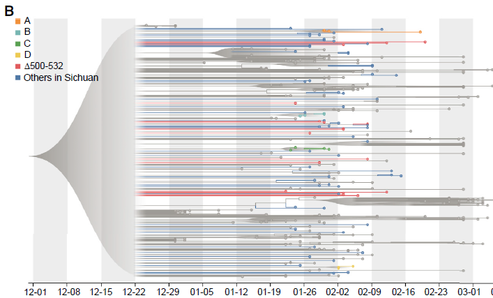 值得注意的是,在Nsp1編碼區有兩個(gè)缺失,Δ500-532和Δ729-737,在四川觀(guān)察到23例(26%)和2例(2.2%);在武漢觀(guān)察到39例(24%)和4例(3%)。對Δ500-532的基因組進(jìn)行了研究,發(fā)現它在系統發(fā)育樹(shù)的不同簇中分布稀疏(圖2B)。結果表明Δ500-532發(fā)生在多個(gè)城市,并可能從武漢多次輸入,這與缺失Δ500-532的四川患者中有83.3%的人有去過(guò)武漢的旅行史相一致。