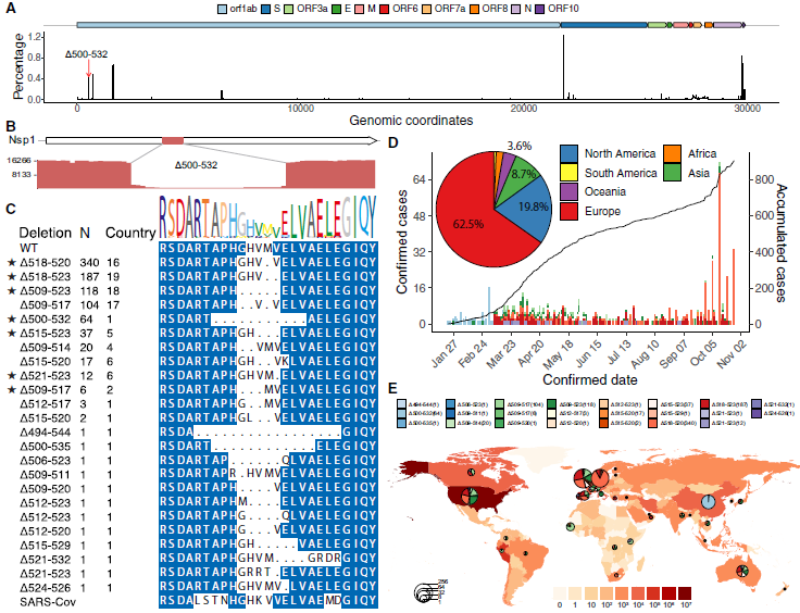 計算了SARS-CoV-2基因組中每個(gè)堿基對的缺失頻率,Δ500-532位點(diǎn)是第五大最常見(jiàn)的缺失區域(圖4A)。測序結果支持高序列深度的缺失,并通過(guò)Sanger測序驗證了缺失(圖4B)。從GISAID的37個(gè)國家的922例病例中,在Δ500-532位點(diǎn)找到了24種缺失變異(圖4C)。其中62.5%和19.8%分別來(lái)自歐洲和北美(圖4D),主要變種為Δ518-520 (Δ1aa), Δ518-523 (Δ2aa)和Δ509-523(Δ5aa)(圖4E)。因此,研究結果顯示SARS-CoV-2基因組中存在一個(gè)缺失熱點(diǎn),相關(guān)病例數量在全球范圍內穩步上升。