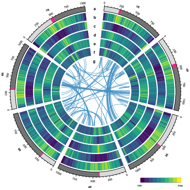 在威寧黑麥基因組與普通小麥3個(gè)亞基因組的比較中,1R、2R和3R分別與小麥1、2和3組染色體完全共線(xiàn)。在4R中發(fā)現與4A/4B/4D、7A/7B/7D或6A/6B/6D部分共線(xiàn)性的三個(gè)區域。5R與5A完全共線(xiàn),與5B、5D部分共線(xiàn)是由于易位的4B或4D片段在5BL或5DL的長(cháng)臂融合(圖3c)。在6R中,觀(guān)察到3個(gè)區域與6A/6B/6D、3A/3B/3D或7A/7B/7D部分共線(xiàn)。這些數據將有助于黑麥在禾本科比較基因組學(xué)研究以及黑麥與普通小麥雜交研究中的應用。