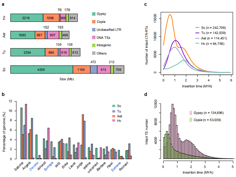 與烏拉爾圖小麥、節節麥及大麥的LTR-RTs進(jìn)行比較發(fā)現:(1)Gypsy是威寧黑麥基因組擴張的主要原因之一(Fig. 2a),并且有3個(gè)LTR-RT家族(Daniela, Sumaya, Sumana)在威寧黑麥中特異擴張,其中Daniela的占比最高 (Fig. 2b)。(2)威寧黑麥中完整的LTR-RTs插入時(shí)間存在獨特的雙峰分布(Fig. 2c),最近一個(gè)擴增峰出現在50萬(wàn)年前,另出現在1.7 百萬(wàn)年(MYA)左右(與大麥相同) (Fig. 2c)。(3)這種雙峰分布模式由Gypsy?RTs的擴增主導(Fig. 2d)。