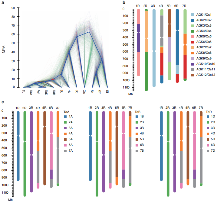 通過(guò)比較威寧黑麥、烏拉爾圖小麥、節節麥、普通小麥(亞基因組TaA、TaB和TaD)、大麥、水稻Os(Oryza sativa ssp.?japonica)、二穗短柄草Bd(Brachypodium distachyon)、玉米Zm(Zea mays)、高粱Sb(Sorghum bicolor)、谷子Si(Setaria italica)基因組,共找到2517個(gè)單拷貝同源基因。通過(guò)對單拷貝基因組構建進(jìn)化樹(shù)和計算分化時(shí)間發(fā)現,在大麥和小麥分化后(15MYA)黑麥和二倍體小麥發(fā)生了分化(9.6 MYA) (Fig. 3a)。