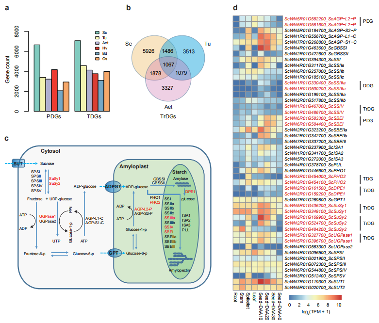 接下來(lái)作者研究了黑麥淀粉生物合成相關(guān)基因(SBRGs)中的基因復制。研究發(fā)現這些重復類(lèi)型在黑麥淀粉生物合成相關(guān)基因(SBRGs)中普遍存在,并且不同的SBRG的復制基因之間往往表現出表達差異,說(shuō)明不同類(lèi)型的基因復制可以豐富黑麥基因在重要生物過(guò)程中的遺傳多樣性(圖4c),這些黑麥SBRGs的新變化可能為調控植物淀粉生物合成和性質(zhì)提供新的酶活性,因此解析全套黑麥SBRGs有利于提高黑麥的產(chǎn)量潛力和營(yíng)養品質(zhì)。