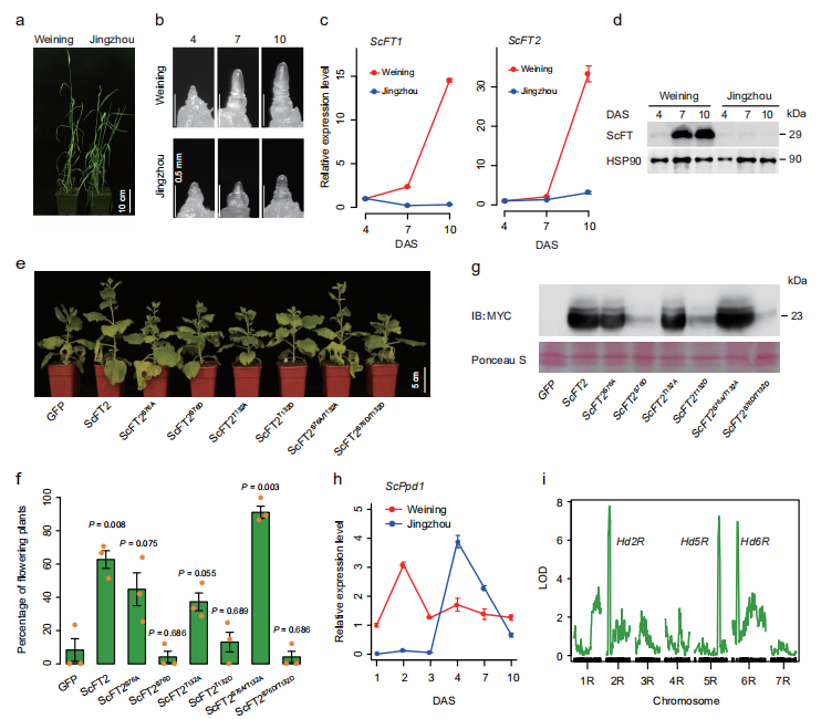 在長(cháng)日照條件下,威寧黑麥比荊州黑麥提前抽穗10-12天(圖6a),這與威寧黑麥莖尖分生組織發(fā)育更快有關(guān)(圖6b)。在威寧黑麥基因組中,注釋到在長(cháng)日照條件下高表達的兩個(gè)開(kāi)花位點(diǎn)(FT)基因ScFT1(ScWN4R01G446100)和ScFT2(ScWN3R01G192500)。播種后7天和10天,ScFT1和ScFT2在威寧黑麥中的表達水平顯著(zhù)高于荊州黑麥(圖6c),且ScFT蛋白在黑麥中積累到相對較高水平,而荊州黑麥中幾乎沒(méi)有(圖6d)。檢測到的ScFT蛋白的大?。▇29 kDa)比預測出的ScFT1和ScFT2的分子量大(~19 kDa)(圖6d),表明ScFT蛋白具有潛在的翻譯后修飾。用高效檢測磷蛋白的磷酸標記SDS-PAGE分析表明,威寧黑麥中ScFT確實(shí)發(fā)生了翻譯后磷酸化修飾。